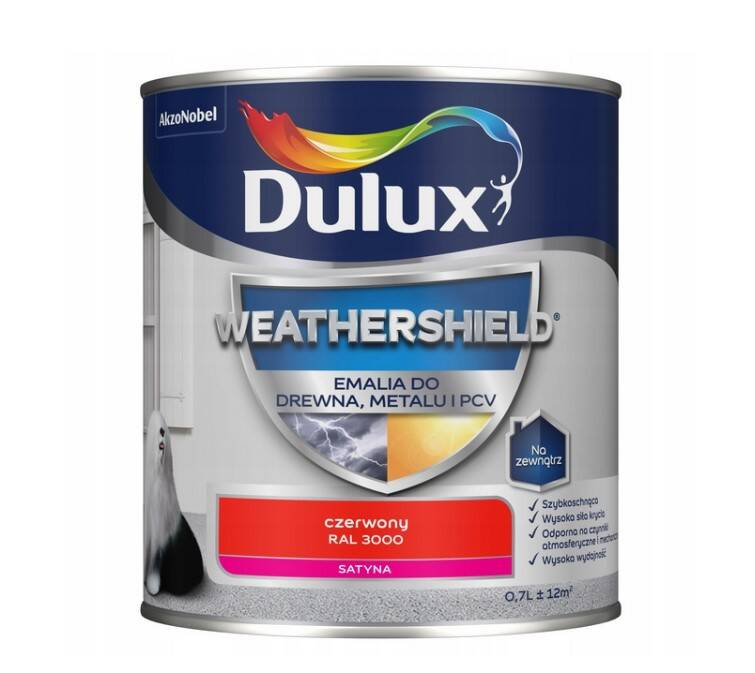 • Dulux Weathershield to wysokiej jakości zewnętrzna, wodna emalia do drewna, metalu i PCV. Uzyskana powłoka jest sucha w dotyku już po 1 godzinie.