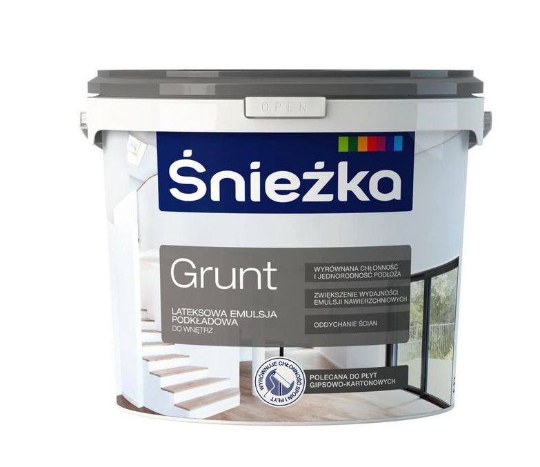 - Śnieżka Grunt dzięki specjalnym dodatkom nakłada się grubą warstwą i niweluje różnice w fakturze i barwie podłoża. Wnika w podłoże poprawiając przyczepność warstwy farby nawierzchniowej oraz zmniejsza jej zużycie.