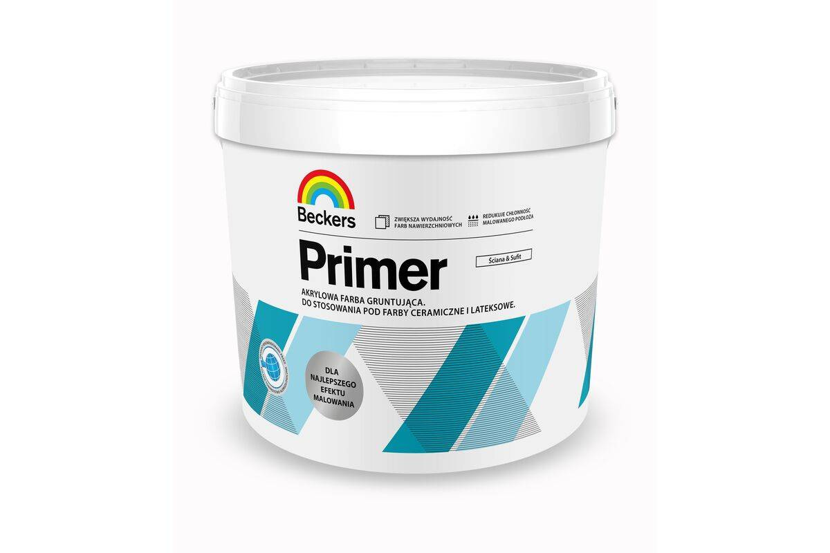 - Farba BECKERS DESIGNER PRIMER zmniejsza chłonność podłoża, poprawia przyczepność i zwiększa wydajność wodorozcieńczalnych farb nawierzchniowych takich jak: farby dyspersyjne, farby lateksowe, farby akrylowe, itd.