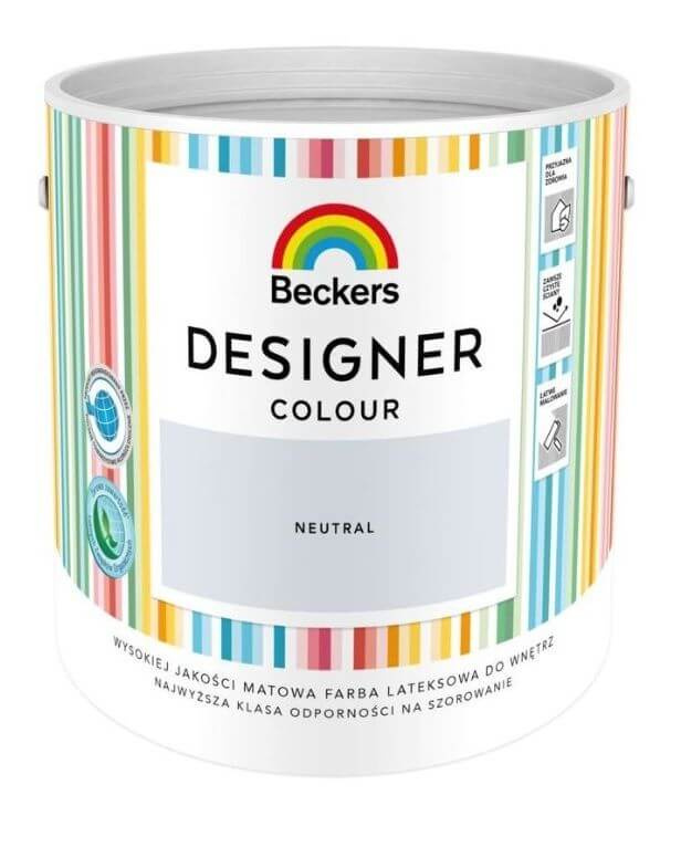 Farby BECKERS DESIGNER COLOUR to kolekcja farb, która powstała aby wyjść naprzeciw potrzeb klienta. Marka BECKERS stworzyła wyjątkowa kompozycję barw, w której znajduje się aż 56 kolorów. W palecie 56 kolorów farb BECKERS DESIGNER COLOUR znajdują się farby, które zaspokoją gusta tych, którzy nie boją się odważnych połączeń kolorystycznych oraz tych, którzy cenią sobie klasyczną elegancję. W palecie barw BECKERS DESIGNER COLOUR znajdą Państwo barwy od delikatnych pasteli do barw mocno nasyconych. BECKERS DESIGNER COLOUR to wysokiej jakości matowa, wodorozcieńczalna farba lateksowa, która polecana jest do malowania ścian i sufitów. Ściany i sufity pomalowane farbą BECKERS DESIGNER COLOUR zyskują piękne matowe wykończenie. Farba lateksowa DESIGNER COLOUR łatwo się rozprowadza, nie chlapie podczas aplikacji. Farba DESIGNER COLOUR jest odporna na zmywanie wodą z dodatkiem detergentów. W celu dokładnego pomalowania podłoża zaleca się stosowanie dwóch warstw farby w odstępie 4 godzin.