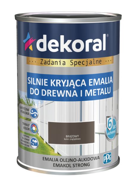 Farba olejno-alkidowa DEKORAL EMAKOL STRONG  silnie kryjąca emalia ftalowa przeznaczona do ogólnego stosowania. Tworzy elastyczną powłokę, dobrze współpracującą z powierzchnią, którą pokrywa. Możesz uzyskać wykończenie zarówno matowe, jak i połyskliwe – to zależy, które rozwiązanie wybierzesz.