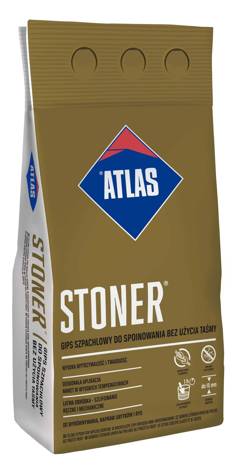 • Gips szpachlowy ATLAS STONER przeznaczony jest do spoinowania płyt gipsowo-kartonowych bez konieczności stosowania dodatkowego zbrojenia w postaci taśm lub flizeliny w przypadku płyt z fabrycznie ukształtowanymi krawędziami.