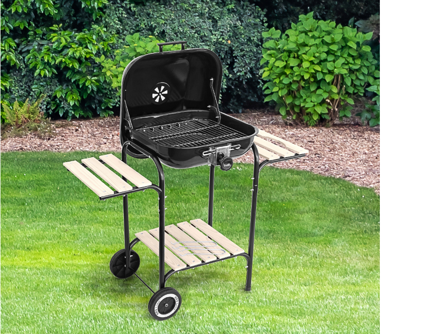 Grill węglowy ze stalową pokrywą i drewnianymi półkami MIRPOL 40x40cm