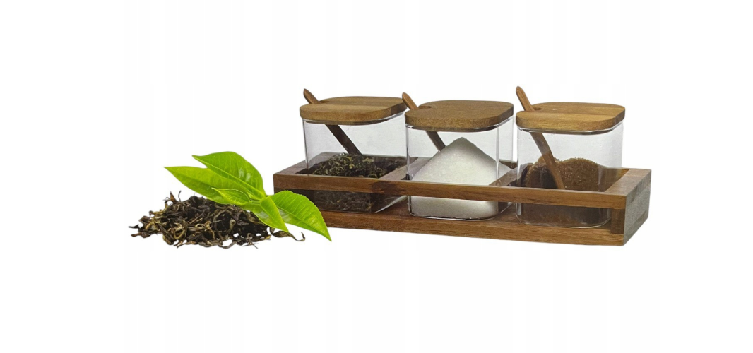 Pojemniczki dołączone do zestawu, są wykonane ze szkła i są zamykane za pomocą drewnianej pokrywki