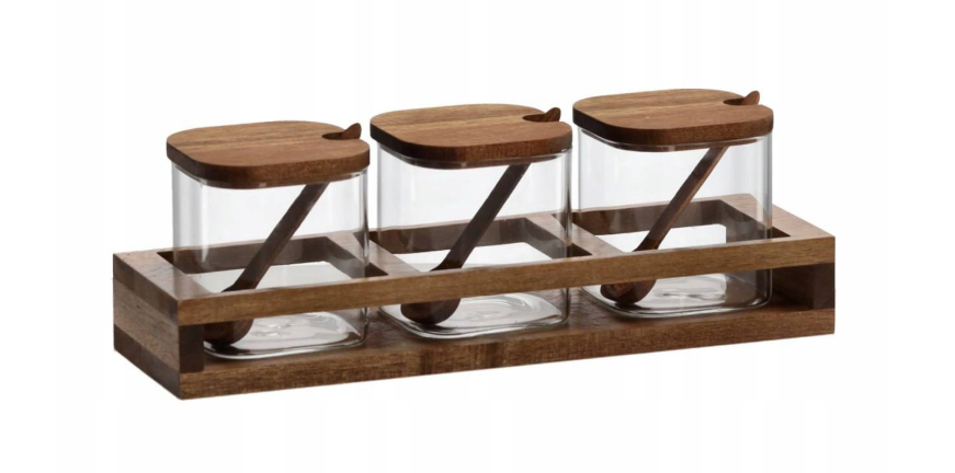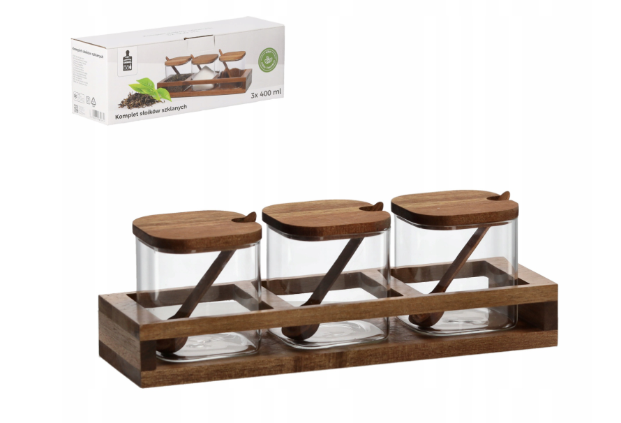 Komplet przyprawników 3 słoiki x400ml z drewnianą podstawką i łyżeczką