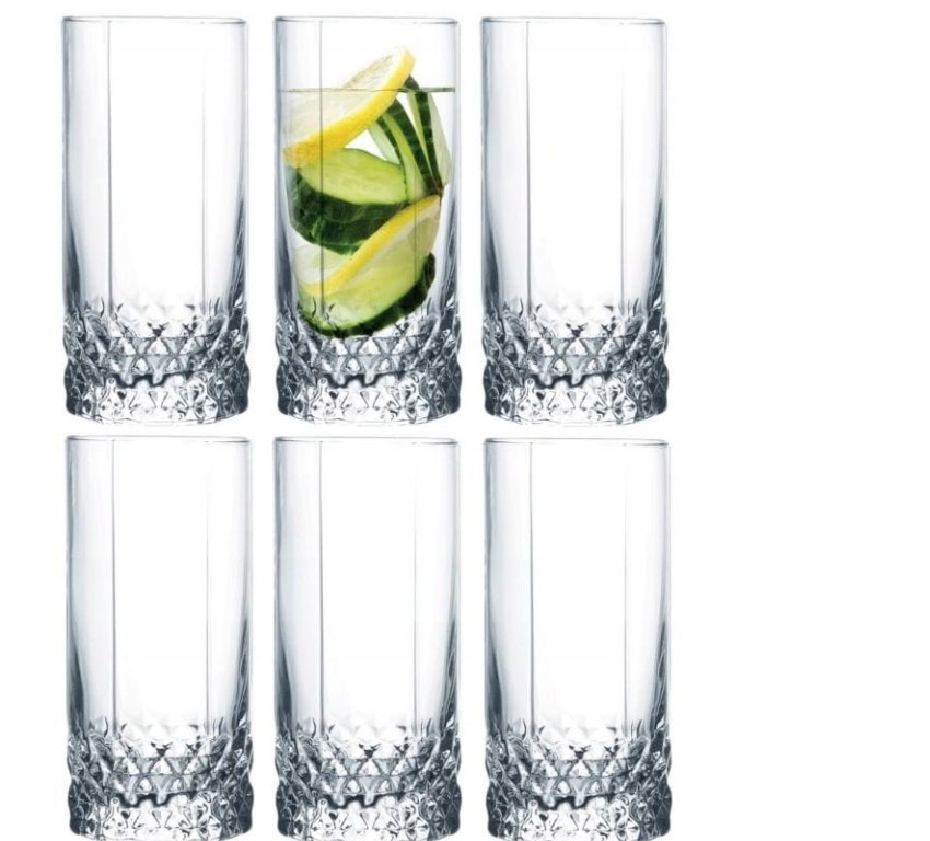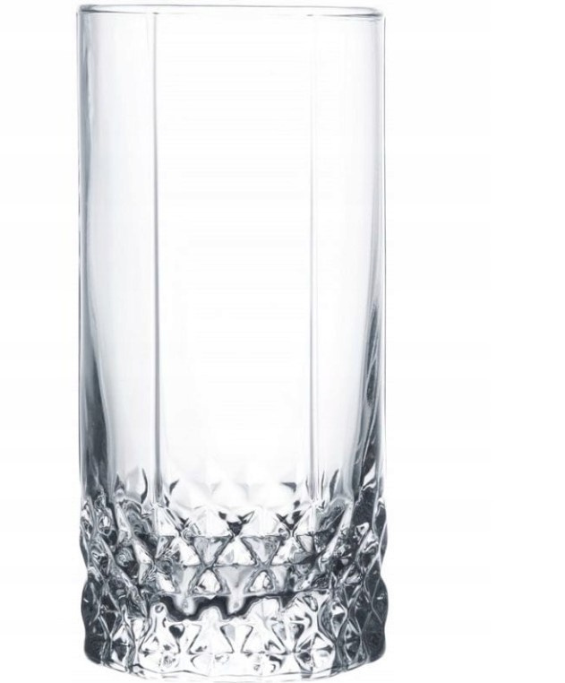 Komplet składający się z sześciu wysokich szklanek, stworzony został z wyjątkowego szkła sodowego, znanego z doskonałej przejrzystości. Ich unikalny kształt, inspirowany diamentowym szlifem, dodaje blasku każdej uroczystości i codziennemu używaniu. Doskonałe do serwowania chłodnych napojów na letnie wieczory oraz spotkania w gronie przyjaciół. Grube dno oraz wzmocniony rant gwarantują trwałość i pewność podczas użytkowania.
