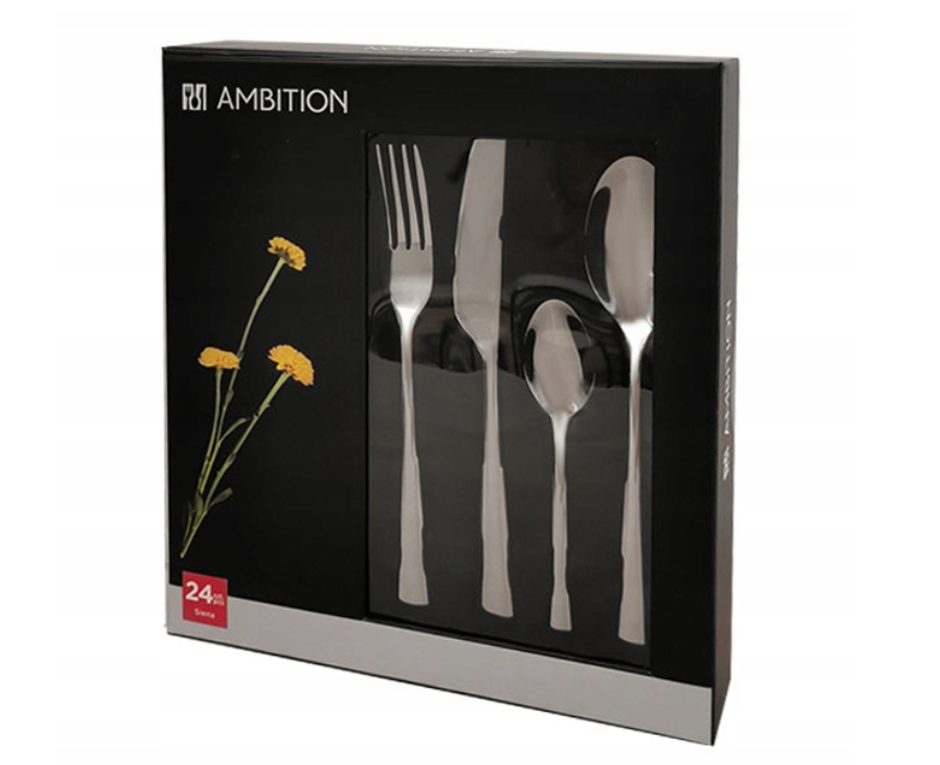 - Zestaw sztućców Siena marki Ambition na 6 osób, składający się z 24 elementów. Linia Siena to ręcznie polerowane sztućce o lustrzanym wykończeniu i klasycznym kształcie.