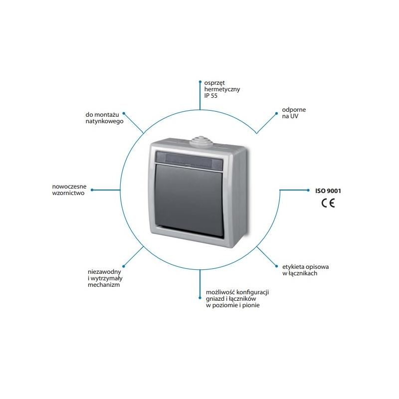 Łącznik podwójny wyposażony w 2 przyciski, przeznaczony do żyrandoli (podzielonych na 2 strefy). Posiada możliwość załączania dwóch różnych scen oświetlenia w pomieszczeniu.