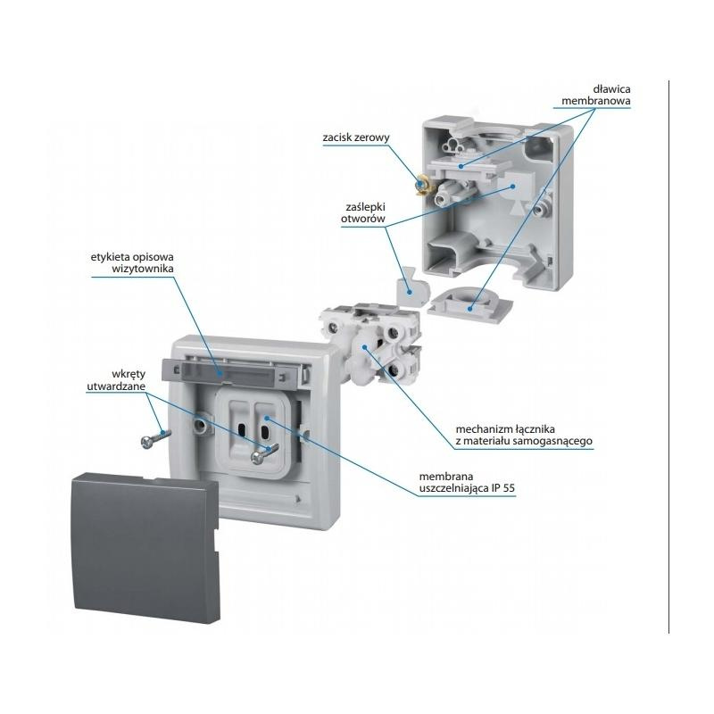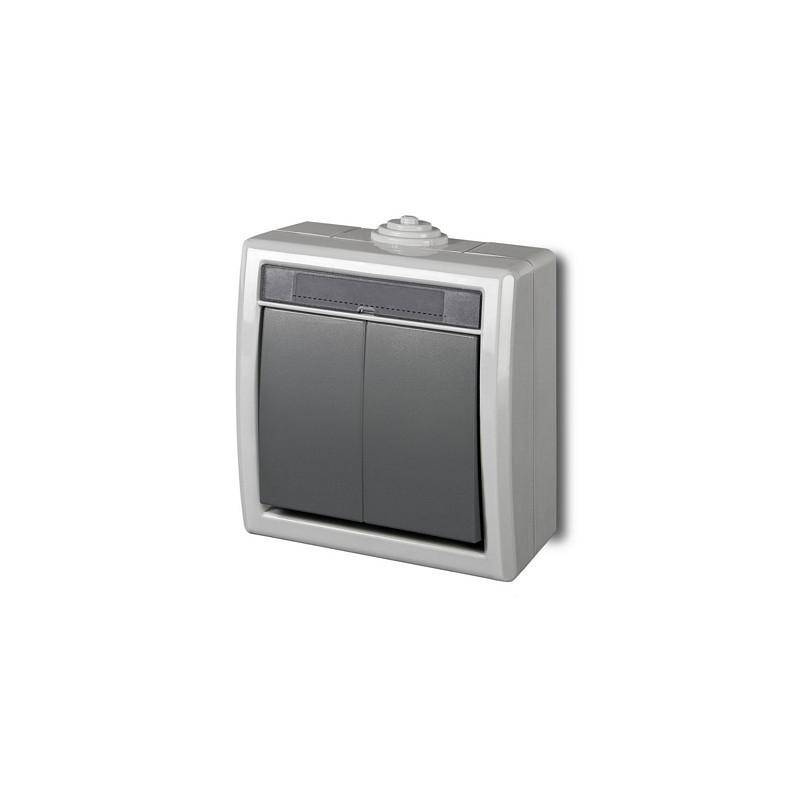 - Łącznik podwójny wyposażony w 2 przyciski, przeznaczony do żyrandoli (podzielonych na 2 strefy). Posiada możliwość załączania dwóch różnych scen oświetlenia w pomieszczeniu.