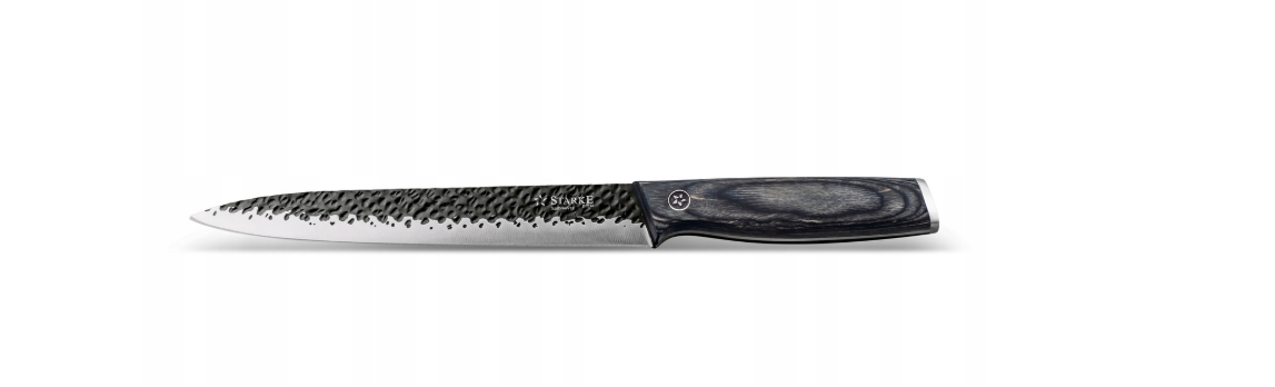 Nóż uniwersalny Starke Pro Hitoshi ma ostrze o długości 20 cm. Wykonano je z bardzo twardej stali chromo-molibdenowo-wanadowej (X50CrMoV15!). Na dodatek zostało wzbogacone o ozdobny deseń wykorzystujący wzór efektu młotkowania metalu. Kupisz więc ekstremalnie ostry i solidny nóż kuchenny. Przede wszystkim przyspieszysz dzięki niemu robienie wielu potraw oraz siekanie składników. Poradzisz sobie nawet z najtwardszymi wyzwaniami kulinarnymi. Stal X50CrMoV15 gwarantuje wysoką jakość produktu. W warunkach użytkowania kuchennego wyróżnia się ponadprzeciętną odpornością na korozję. W Niemczech jest niezwykle popularna i doceniana - zarówno przez użytkowników jak i producentów sprzętu kuchennego. Popularne jest wręcz nazywanie jej „niemiecką stalą”. Za zachodnią granicą wykonuje się z niej nie tylko noże, ale także sztućce. Prezentowany nóż uniwersalny ma rękojeść z egzotycznego drewna pakka. Jest ono odporne na działanie wilgoci i świetnie leży w ręce. Wygodnie ułożysz go w dłoni podczas pracy nad daniami. Co więcej, bez trudu przywrócisz mu ostrość oraz przechowasz na listwie magnetycznej. Wybierając ten produkt, zaopatrzysz domową kuchnię w prestiżowy nóż z drewnianą rękojeścią, ceniony przez każdego, kto gotuje z pasją.