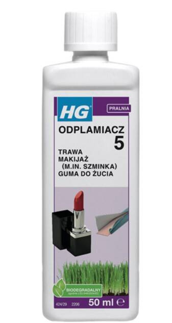 HG odplamiacz 5 to produkt przeznaczony do usuwania plam po markerach z odzieży, który usuwa także plamy wywołane makijażem, trawą, pyłkami i gumą do żucia, ale też maskarą, farbami wodnymi, glebą, gliną, piaskiem i żwirem. HG odplamiacz 5 to jeden spośród 7 specjalnych odplamiaczy firmy HG.