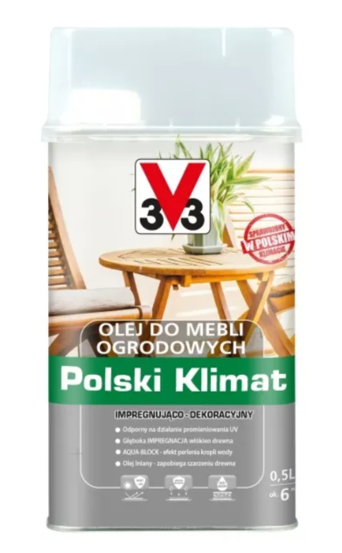 • Olej do mebli ogrodowych V33 bezbarwny jest przydatnym i funkcjonalnym preparatem. To łatwy w aplikacji produkt, który ma podwójne zastosowanie: podkreśli naturalny wzór drewna oraz zabezpieczy każdy element przed warunkami atmosferycznymi.