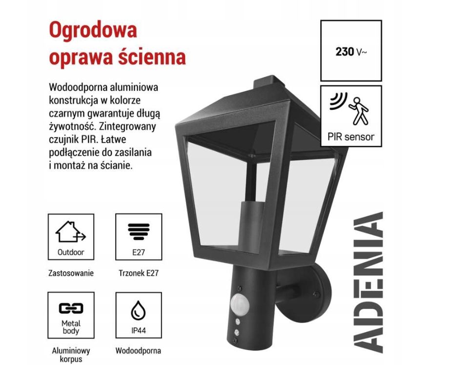 Oprawa naścienna GARDEN ADENIA 30cm, na żarówkę E27 max 15W, IP44, PIR