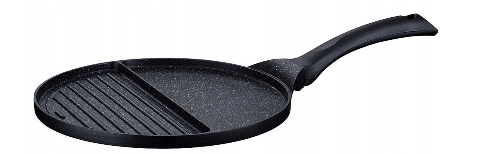 Wydzielone 2 pola do grillowania mięs lub ryb oraz osobne dla warzyw. Wykonana z masywnego odlewanego aluminium. Pokryta granitową powłoką nowej generacji. W odróżnieniu od klasycznych, lekkich patelni ta nagrzewa się mocniej i trzyma temperaturę dłużej. Posiada silikonowy, nienagrzewający się uchwyt.