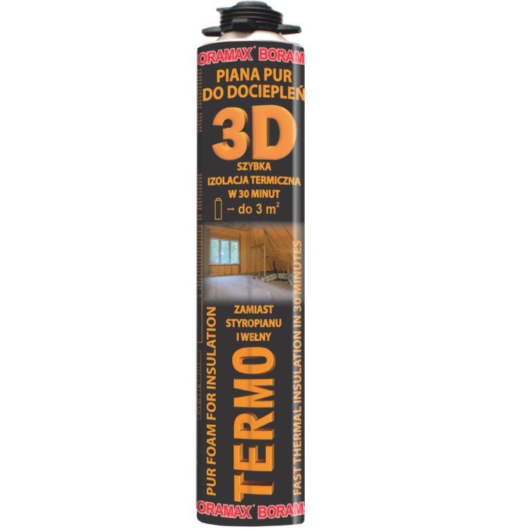 Gotowa do użycia, wysokiej jakości, jednoskładnikowa termoizolacja o wszechstronnym zastosowaniu. Idealne rozwiązanie do natychmiastowej poprawy izolacyjności termicznej i akustycznej, ograniczenia utraty energii oraz eliminacji mostków termicznych we wszelkich konstrukcjach i na wszelkich podłożach budowlanych i przemysłowych. Zapobiega kondensacji pary wodnej. Piana natryskowa TERMO 3D ma znakomitą przyczepność do betonu, betonu komórkowego, tynku, kamienia, drewna i płyt drewnopochodnych, płyt G-K i włókno-cementowych, pianek izolacyjnych poliuretanowych i fenolowych, podłoży bitumicznych z posypką, metali, PVC, EPS i wielu innych tworzyw sztucznych (z wyjątkiem silikonu, PE, PP i PTFE). Idealna do izolacji rur, kanałów, przewodów wentylacyjnych itp. Aplikator pistoletowy zapewnia wysoką wydajność i precyzję nakładania, a obrotowa dysza umożliwia aplikację strumienia zarówno w pionie jak i w poziomie. Nie zawiera rozpuszczalników ani gazów szkodliwych dla warstwy ozonowej