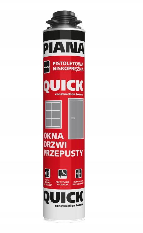 Piana poliuretanowa montażowa QUICK przeznaczona jest do uszczelniania przestrzeni między ościeżami a ościeżnicami okien i drzwi, wykonanymi z drewna, metalu lub PVC-U, przy montażu okien i drzwi (z wyjątkiem drzwi klasyfikowanych w zakresie odporności ogniowej), przy czym montaż ten powinien być wykonywany przy użyciu łączników mechanicznych.