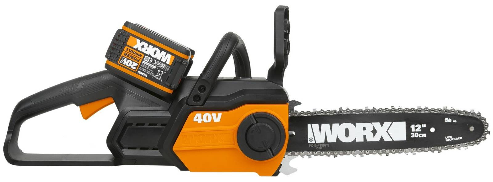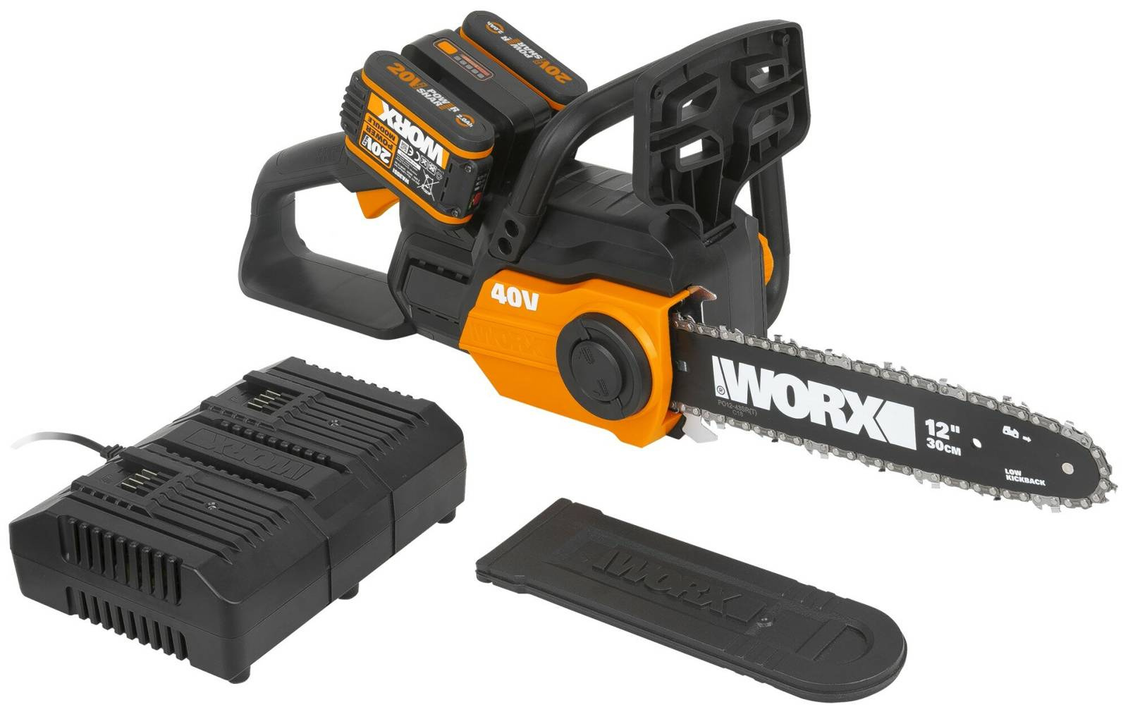 Akumulatorowa piła łańcuchowa WORX WG381E zasilana jest dwoma akumulatorami 20 V zapewniającymi dużą moc i długi czas pracy.