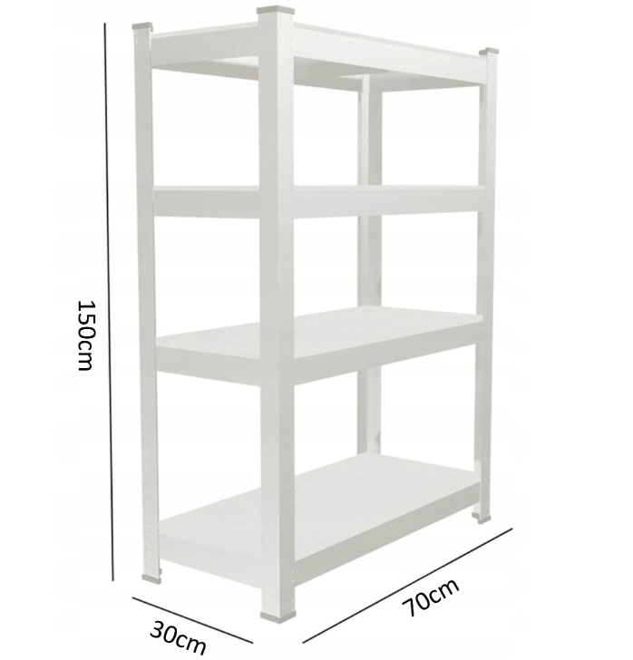 Stabilny regał z czterema półkami to świetny produkt dla każdego kto lubi porządek. Składanie całości zajmuje tylko 15 min. Możliwość modyfikowania odległości między półkami. Możliwość tworzenia 2 mniejszych regałów. Regał montowany na wcisk.