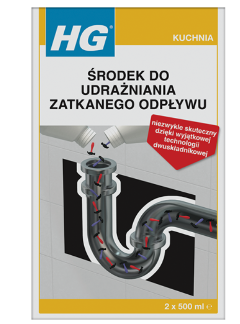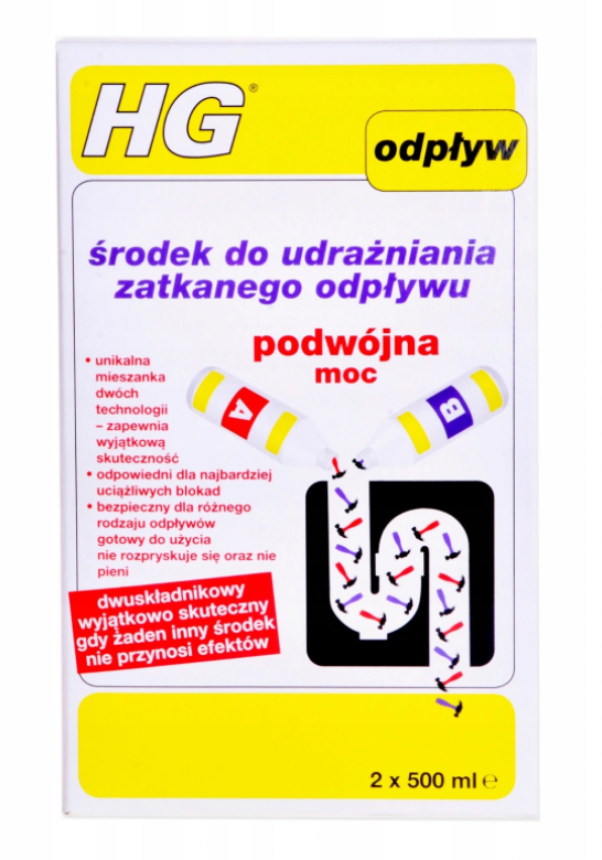 HG środek do udrażniania zatkanego odpływu - podwójna moc to specjalnie opracowany i ulepszony środek z zamiarem walki z najbardziej uciążliwymi blokadami z tłuszczu, resztek pożywienia, włosów i pozostałości po mydle i kosmetykach. Przeznaczony zarówno do odpływów kuchennych jak i łazienkowych. Oparty na unikalnej 2 - składnikowej formule (butelka A i B), która gwarantuje skuteczne udrożnienie odpływu, nienależnie od rodzaju blokady.