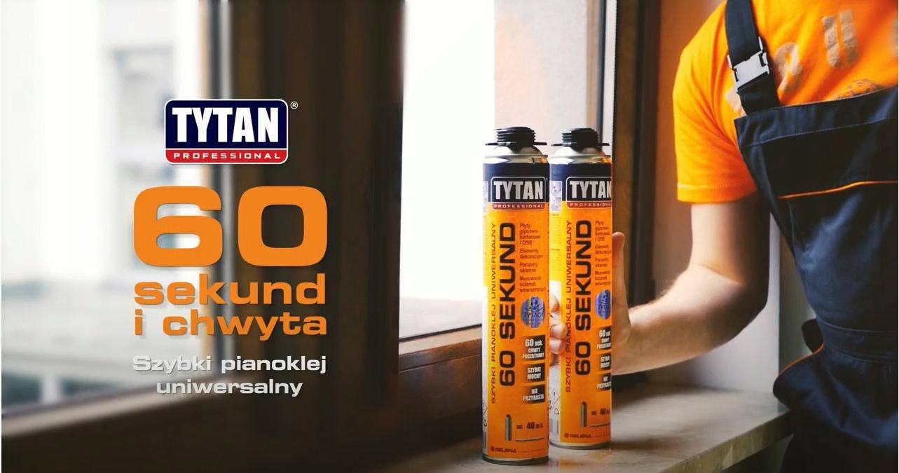 Zastosowanie pianko-kleju TYTAN znacznie przyspiesza wykonanie prac: chwyt początkowy już po 60 sekundach, a pełne utwardzenie uzyskuje już po 24 h. Szybki piano-klej uniwersalny TYTAN 60 SEKUND wykazuje doskonałą przyczepność do typowych materiałów konstrukcyjnych, np.: pustaki, bloczki silikatowe, mury z cegły, płyty G-K, płyty OSB, beton, tynki, drewno, metale, a nawet styropian, twarde PVC i sztywne piany PUR.
