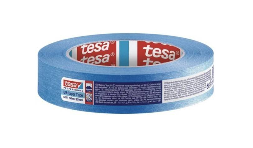 TESA Professional 4431 UV Paper Mask 50mx25mm to lekko krepowana taśma papierowa z akrylową substancją klejącą. Taśma ta znajduje zastosowanie w różnego rodzaju zewnętrznych pracach malarskich, np. to zabezpieczenia drzwi garażowych, balustrady balkonu. Można ją stosować z różnymi rodzajami farb. Niebieska taśma maskująca jest odporna na promieniowanie UV przez tydzień, co pozwala wykonać bardziej wymagające prace malarskie. Łatwa w aplikacji, zapewnia uzyskanie prostych i czystych krawędzi malarskich.