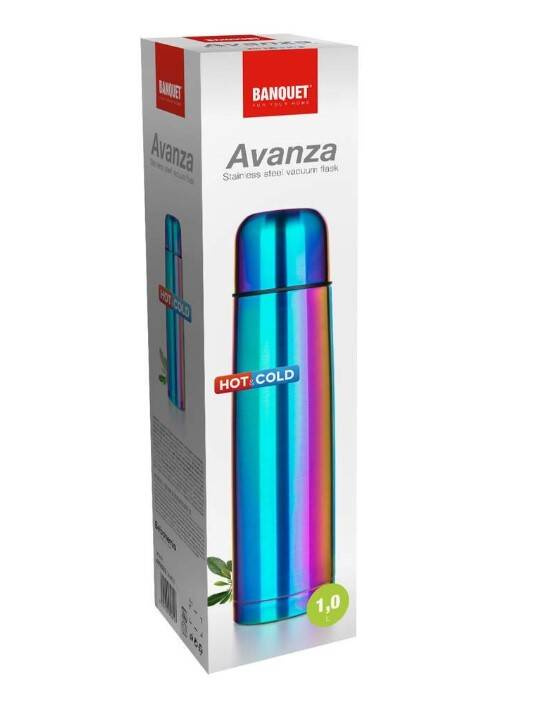 Termos ze stali nierdzewnej AVANZA Rainbow matowy 1 litr, próżniowy, konstrukcja z podwójnymi ściankami, stal nierdzewna 201 - powierzchnia zewnętrzna i wewnętrzna, plastikowa nakładka - klips ułatwiający użytkowanie (jedno naciśnięcie otwiera termos, drugie zamyka), pokrywa termosu może służyć jako kubek do picia. Termosy ze stali nierdzewnej są bardzo trwałe i bezpieczne, nie ma niebezpieczeństwa pęknięcia wkładu lub poparzenia podczas manipulacji. Spadek temperatury zależy od temperatury napoju podczas napełniania, ilości napoju, temperatury otoczenia.