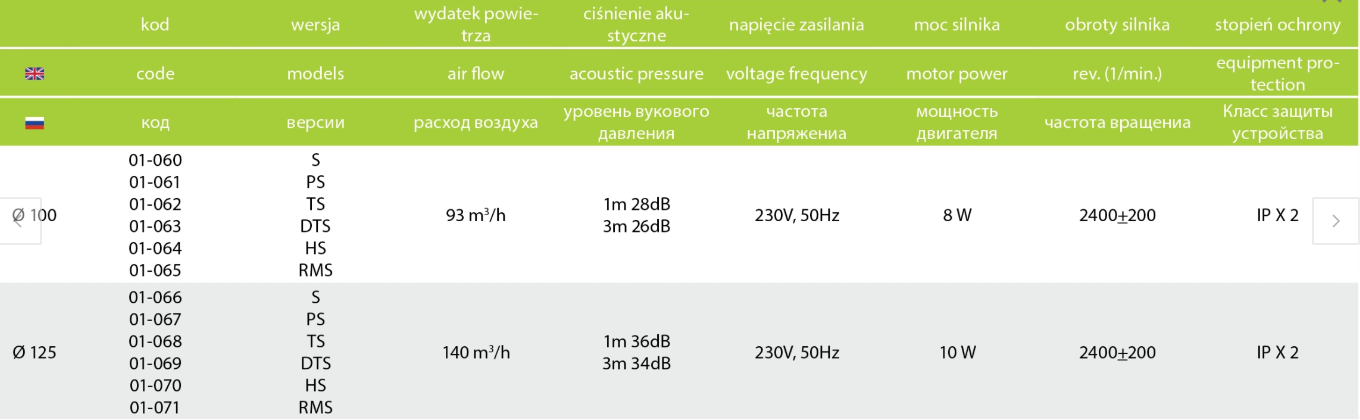 Dane techniczne wentylatora rRim