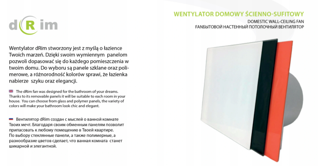 charakteryzuje się ozdobnymi panelami dostosowującymi się do każdego pomieszczenia. Dzięki temu zyskuje niepowtarzalny i elegancki wygląd. Jest idealny nie tylko do łazienki, ale także do pozostałych wnętrz. System wymiany paneli jest bardzo prosty i umożliwia umycie czy wymianę, kiedy tylko zajdzie taka potrzeba. Specjalny zabezpieczający klik panela, a także łożyska kulkowe umożliwiają zamontowanie naszego dRima także na suficie. Łopatki turbiny wentylatora są kształtowane, dzięki czemu pracuje prawie bezszelestnie.