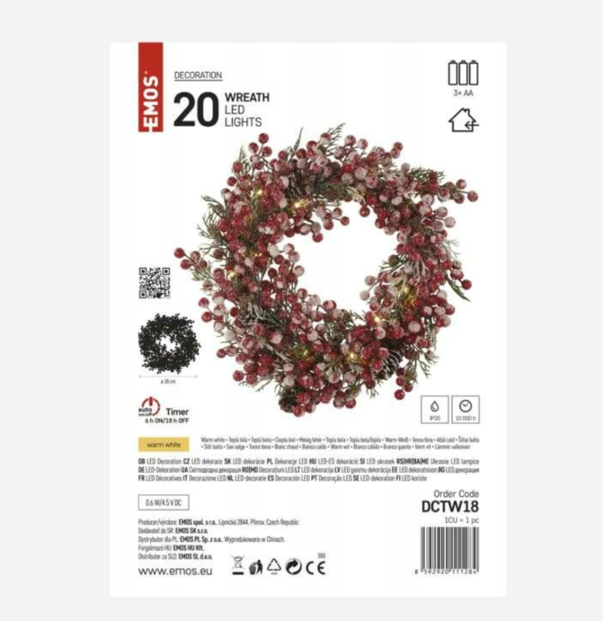 Wianek świąteczny 20LED EMOS 38cm ciepły biały 3xAA timer