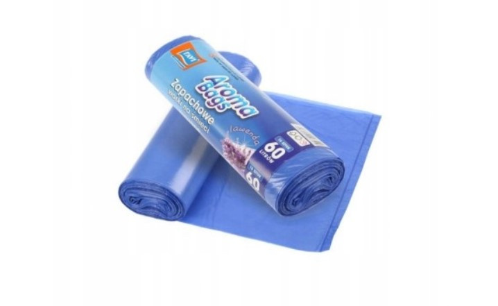 - Worki na śmieci Aroma Bags o zapachu lawendy. Worki mają pojemność 60l, a w jednym opakowaniu znajduje się 16 sztuk. Bardzo wygodne, ponieważ posiadają wiązanie. Wykonane są z folii LD/HD w kolorze fioletowym.
