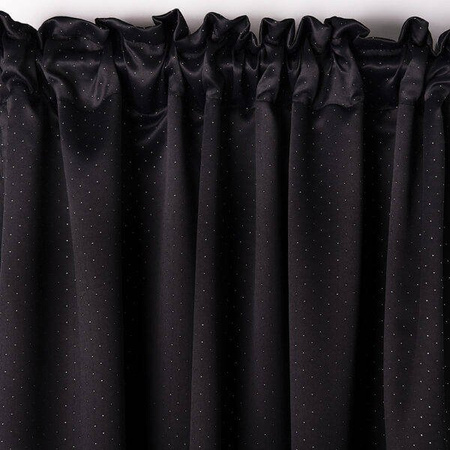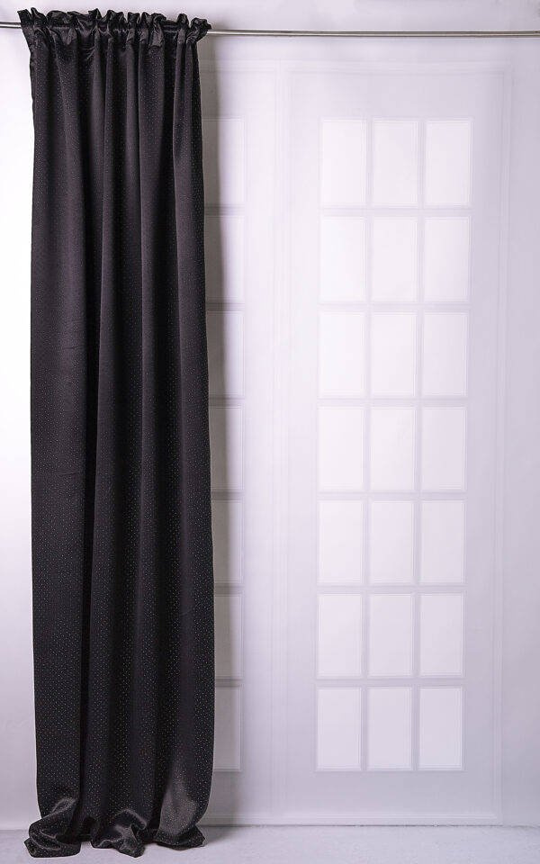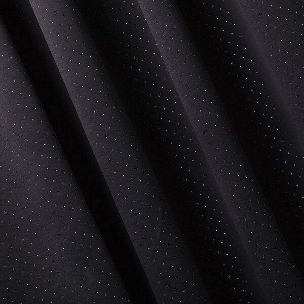 Zasłona zaciemniająca ze ślicznej, mięsistej tkaniny w kolorze czarnym z nadrukiem w drobne srebrne kropeczki. Prezentuje się bardzo elegancko, zachwyca prostotą oraz minimalizmem. Niezwykle ważnym aspektem jest funkcja zaciemniania światła.