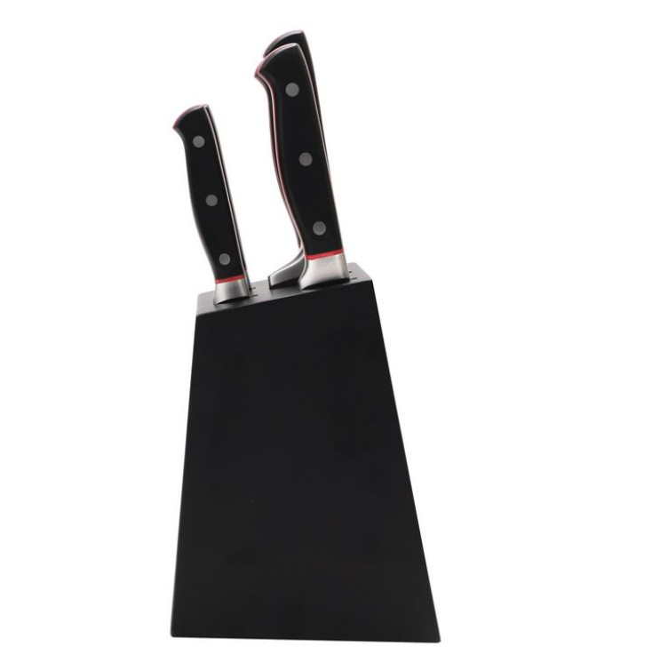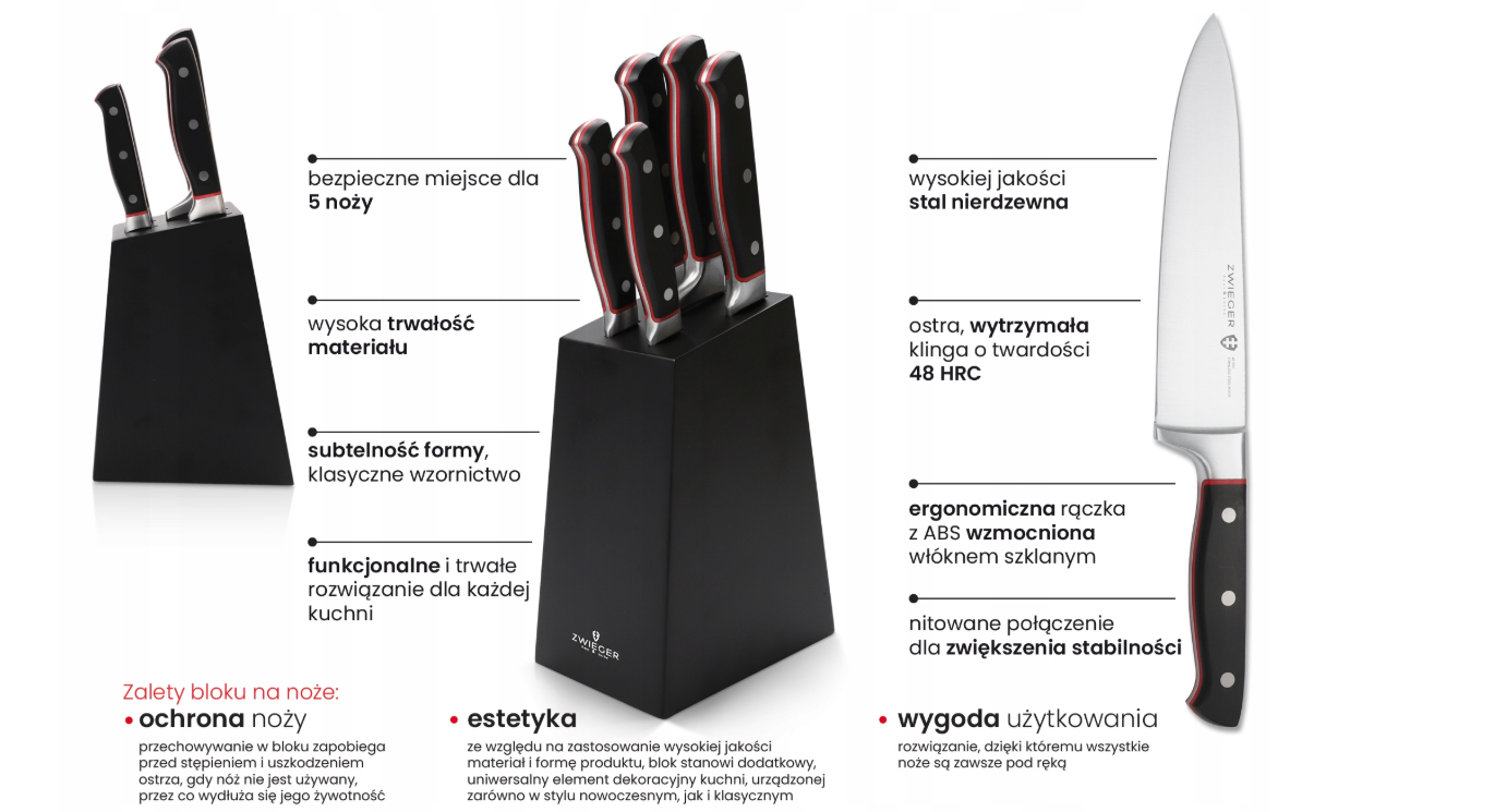 Blok z zestawem 5 noży KLASSIKER to połączenie funkcjonalności, trwałości i nowoczesnego wzornictwa. Wykonany z trwałego, estetycznego i będącego nowoczesną alternatywą dla drewna tworzywa MDF. Wykończony został czarnym lakierem silikonowym i doskonale wpisuje się w minimalistyczne aranżacje kuchni. Zestaw zawiera pięć najczęściej używanych noży kuchennych, zapewniając im praktyczne i bezpieczne miejsce przechowywania. Noże te zostały wykonane z wysokiej jakości stali nierdzewnej o twardości 48 HRC, co gwarantuje wytrzymałość ostrzy i stosunkowo rzadkie ich późniejsze ostrzenie. Ergonomiczne rękojeści z tworzywa ABS, dodatkowo wzmocnione włóknem szklanym i ozdobione czerwoną wstawką, nie tylko świetnie leżą w dłoni, ale również zapewniają trwałość połączeń dzięki nitowanemu łączeniu. Zestaw obejmuje komplet noży niezbędnych w codziennej pracy kuchennej: nóż szefa, nóż do chleba, nóż do plastrowania, nóż uniwersalny oraz nóż do warzyw i owoców. Każdy z nich zaprojektowano z myślą o precyzji cięcia, wygodzie użytkowania i trwałości materiałów.