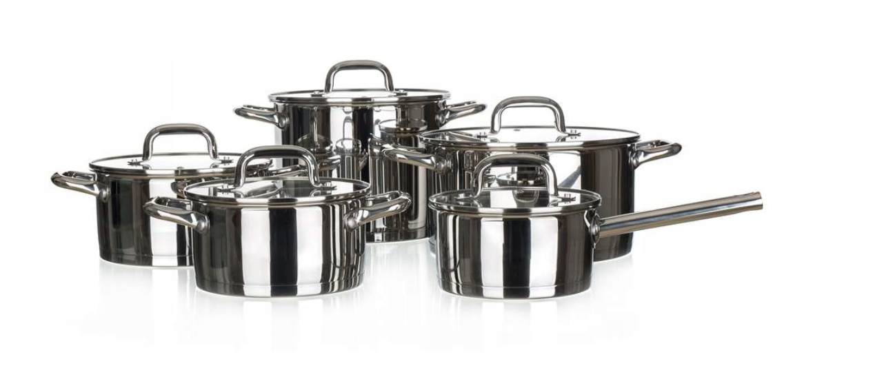 Zestaw garnków ze stali nierdzewnej 10-częściowy z pokrywą, wysoki garnek 22 x 17 cm, 6,4 l ze szklaną pokrywą. Powierzchnia zewnętrzna i wewnętrzna w połysku, wewnątrz garnka miarka. Naczynia można używać na wszystkich typach kuchenek, w tym na indukcji.